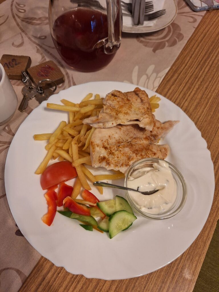 Dnešní oběd - čočková polévka a rajská. K večeři kuřecí plátek a hranolky. Nedělní lyžovačka byla skvělá a k tomu nám svítilo sluníčko. Proběhlo první bodování pokojů s naprosto skvělým výsledkem. Těšíme se na pondělí.